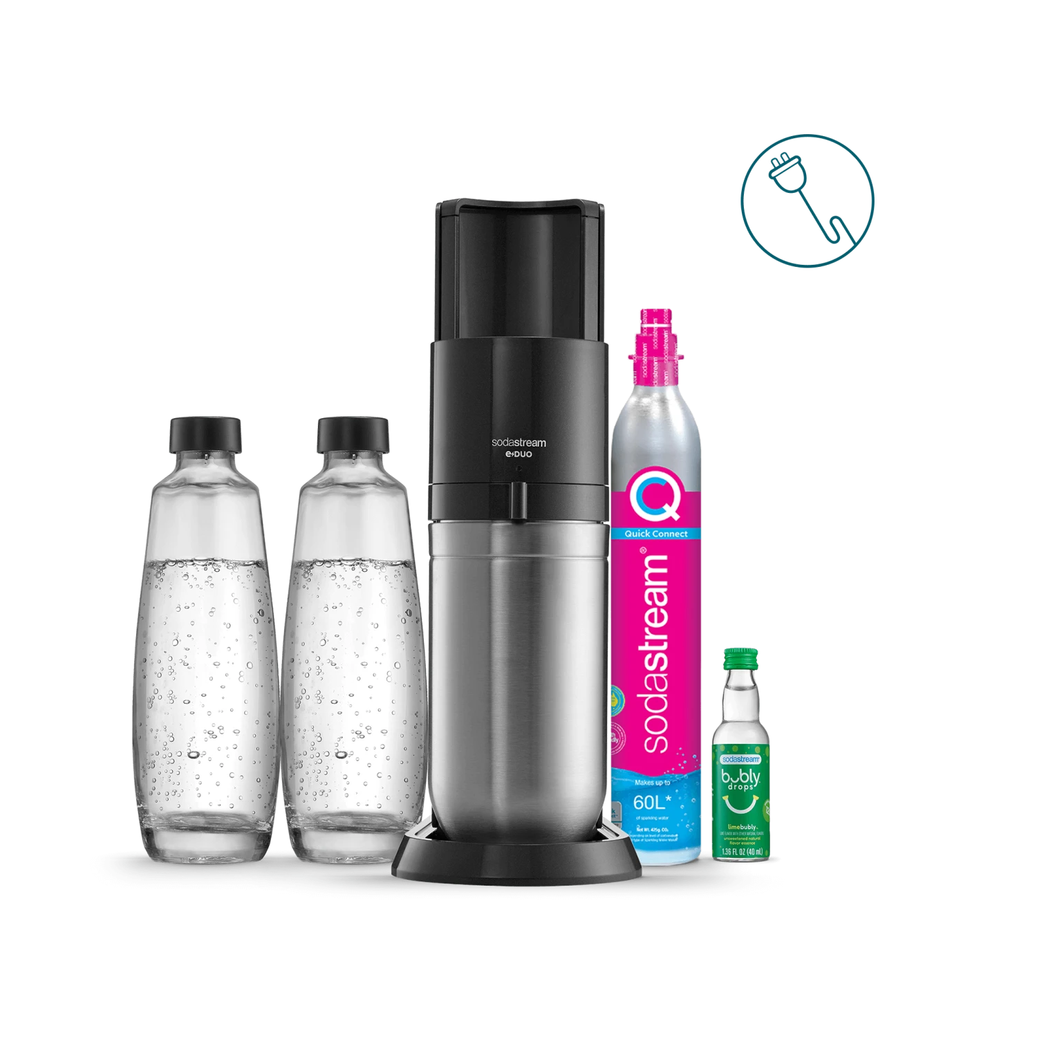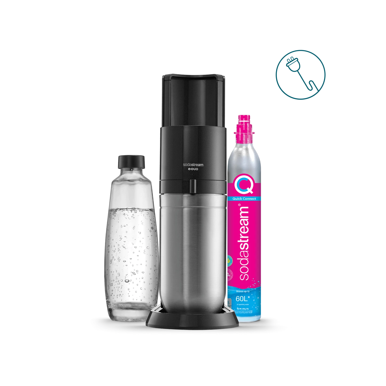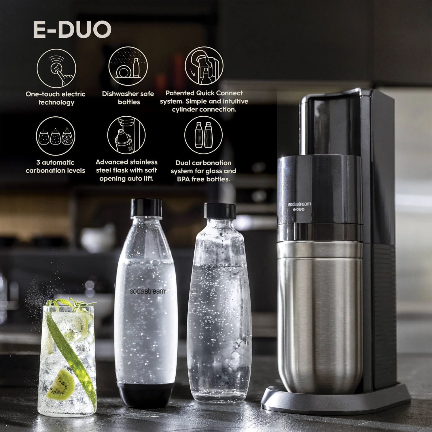 The premium E-Duo sparkling water maker offers consistency of carbonation with one simple touch.