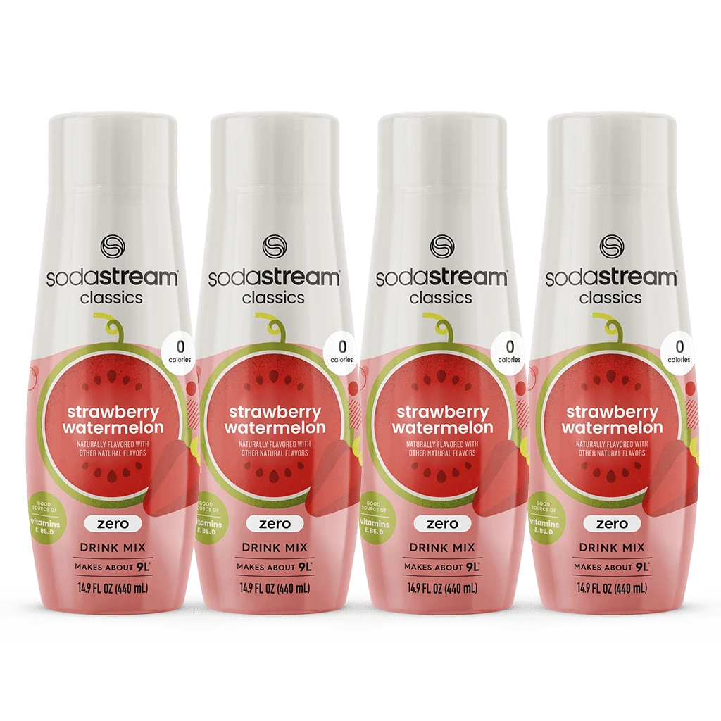 Includes: (4) 14.9 fl.oz SodaStream® Classics Strawberry Watermelon Drink Mix